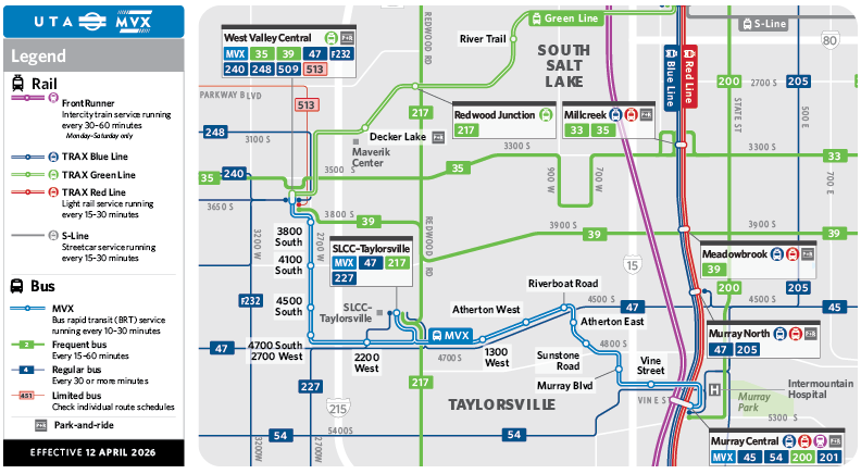 Midvalley Express (Route 50X) will begin service between West Valley Central and Murray Central on April 12, 2026. MVX will be Zero Fare through April 2029.