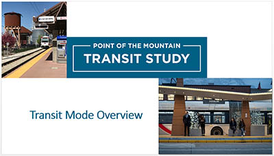 The Point of the Mountain Transit Study is a partnership of governments and agencies exploring transit corridor improvements for the rapidly growing communities of southern Salt Lake County and northern Utah County. The desired outcome of the transit study will be the identification of a Preferred Alternative. The Preferred Alternative will identify the:
