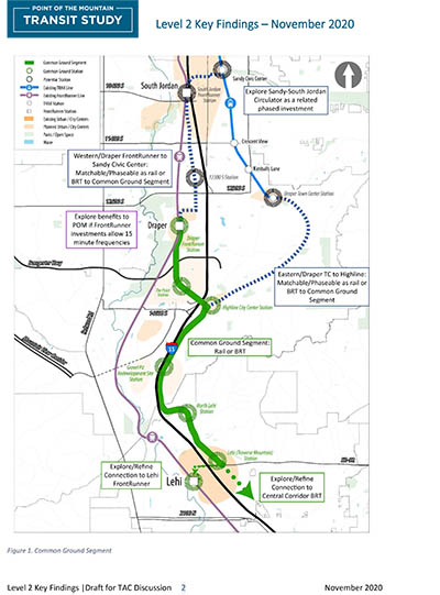 The Point of the Mountain Transit Study, which UTA has been conducting in collaboration with project partners since the fall of 2019, has concluded a detailed alternatives analysis and published the findings for public feedback through a survey (November 23 through December 10, 2020). Findings of this detailed analysis, with consideration of public feedback, will guide selection of a Locally Preferred Alternative (LPA) which specifies a transit alignment and mode (type of technology) that would provide high-capacity transit service from southern Salt Lake County to northern Utah County. The transit alignment considered, referred to as the “Common Ground Segment,” builds off of previous analysis and public feedback and is a shared transit corridor that was proposed in all previous alternatives.